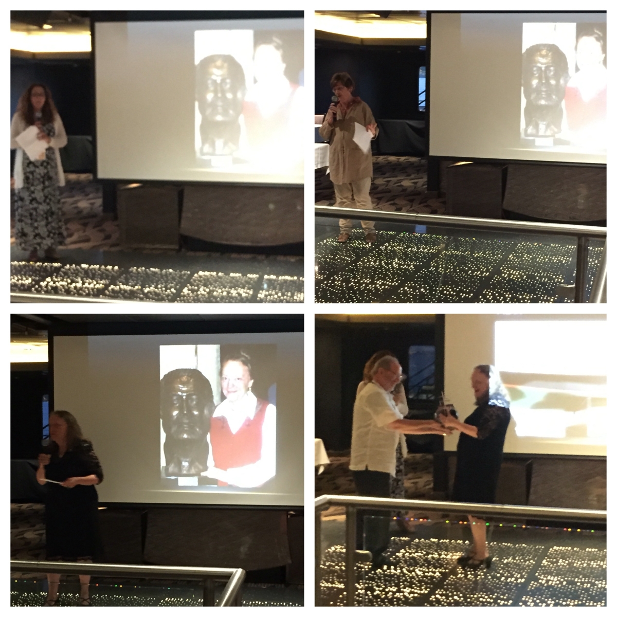 But the most important part of the evening came after dinner with the tributes to Susan Beegel, the former editor of the Hemingway Review. Our current editor, Suzanne del Gizzo, offered some very nice words, sweetly recalling all that she learned from Susan and how she helped her as she took over editing the journal. Suzanne was followed by Linda Wagner-Martin, who offered very kind words as well about her years of knowing Susan. Finally, Susan took the microphone and spoke about her experience as the editor and thanked many of the people who were particularly helpful to her during that time. Finally, Steve Paul presented Susan with a lovely replica of Hemingway’s famous boat, Pilar, as a way to commemorate her time as editor and to say “thank you” for all her hard work. Throughout this whole presentation, I found myself oddly moved. Well, perhaps not oddly because I understood why I felt this way. It was, once again, that sense of community and compassion that came through. You could tell the relationships that existed between Susan and Suzanne and Linda and Steve were not purely professional, but that a real friendship existed. It made me happy to be a part of a group that fosters that kind of good will toward one another. It was, and I mean this in the best and most honest sense of the word, very sweet. By the time all this had finished, we’d reached the dock back in Chicago and it was time exit the ship and head back to Oak Park. We got on our respective buses and started the drive back. I sat in the back of our bus quoting favorite Simpsons lines with Robert Trogdon and feeling very much at home and happy to be where I was.